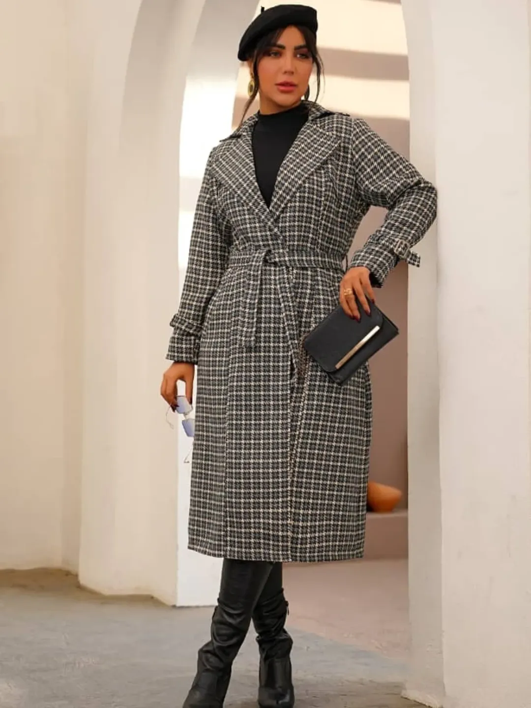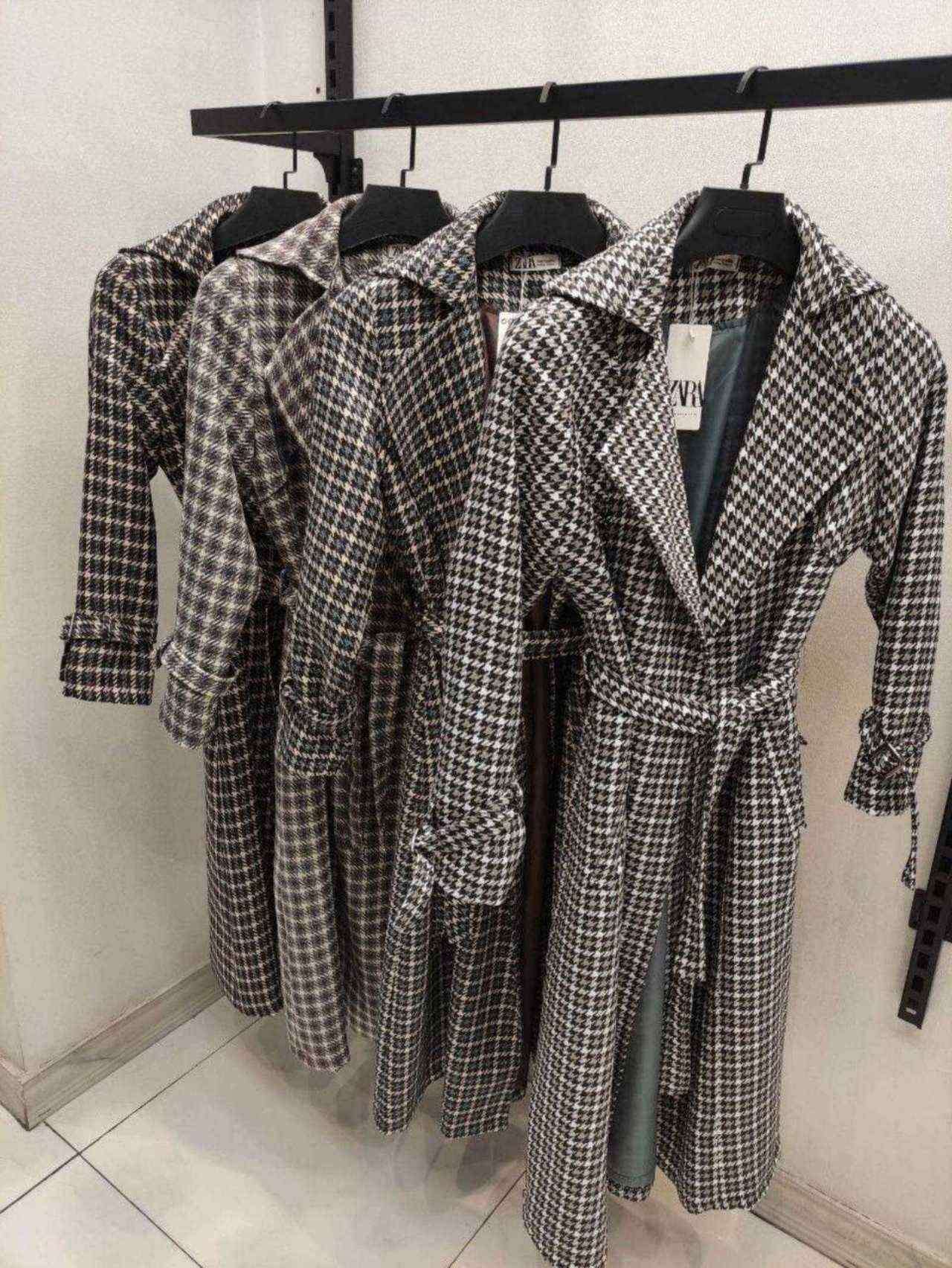 پالتو با یقه انگلیسی و کمردار، قد 118 تا 120 سانتیمتر و رنگ بندی 4 رنگ. پارچه توییت چهار خانه با آستر باکیفیت.